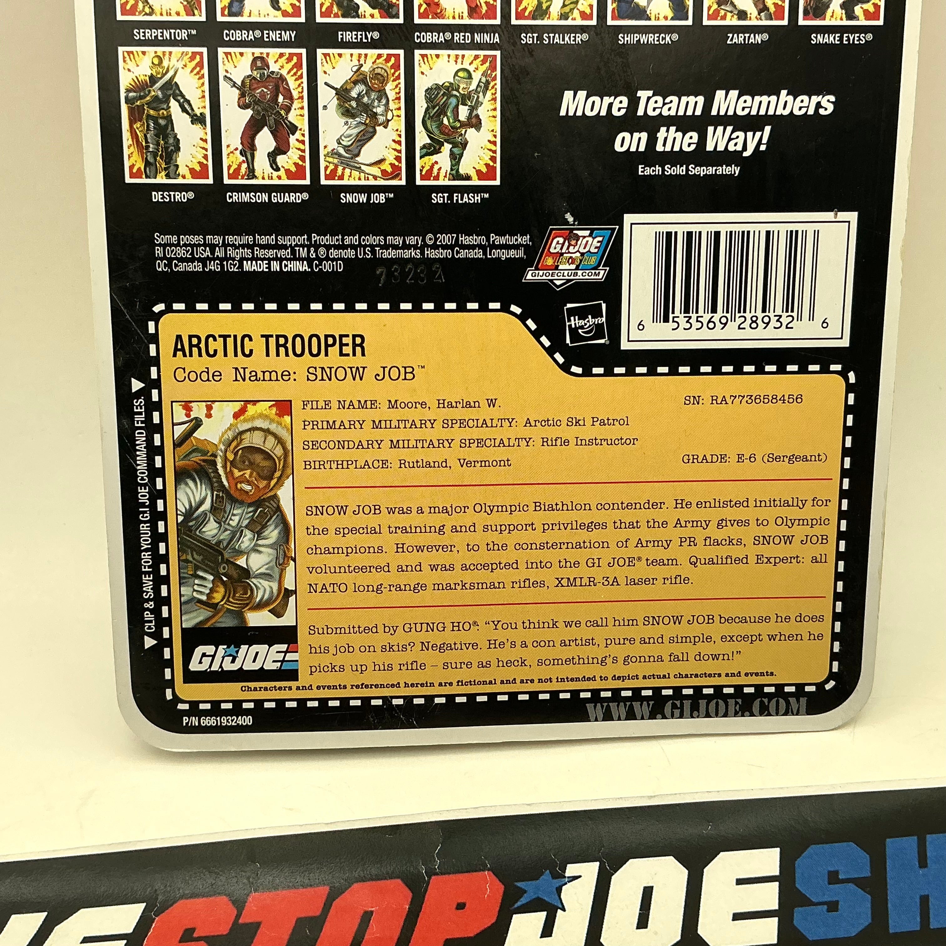 "SNOW JOB WAS A MAJOR OLYMPIC BIATHLON CONTENDER. HE ENLISTED INTIALLY FOR THE SPECIAL TRAINING AND SUPPORT PRIVILEGES THAT THE ARMY GIVES TO OLYMPIC CHAMPIONS. HOWEVER, TO THE CONSTERNATION OF ARMY PR FLACKS, SNOW JOB VOLUNTEERED AND WAS ACCEPTED INTO THE G.I. JOE TEAM. QUALIFIED. EXPERT: ALL NATO LONG-RANGE MARKSMAN RIFLES, XMLR-3A LASER RIFLE."