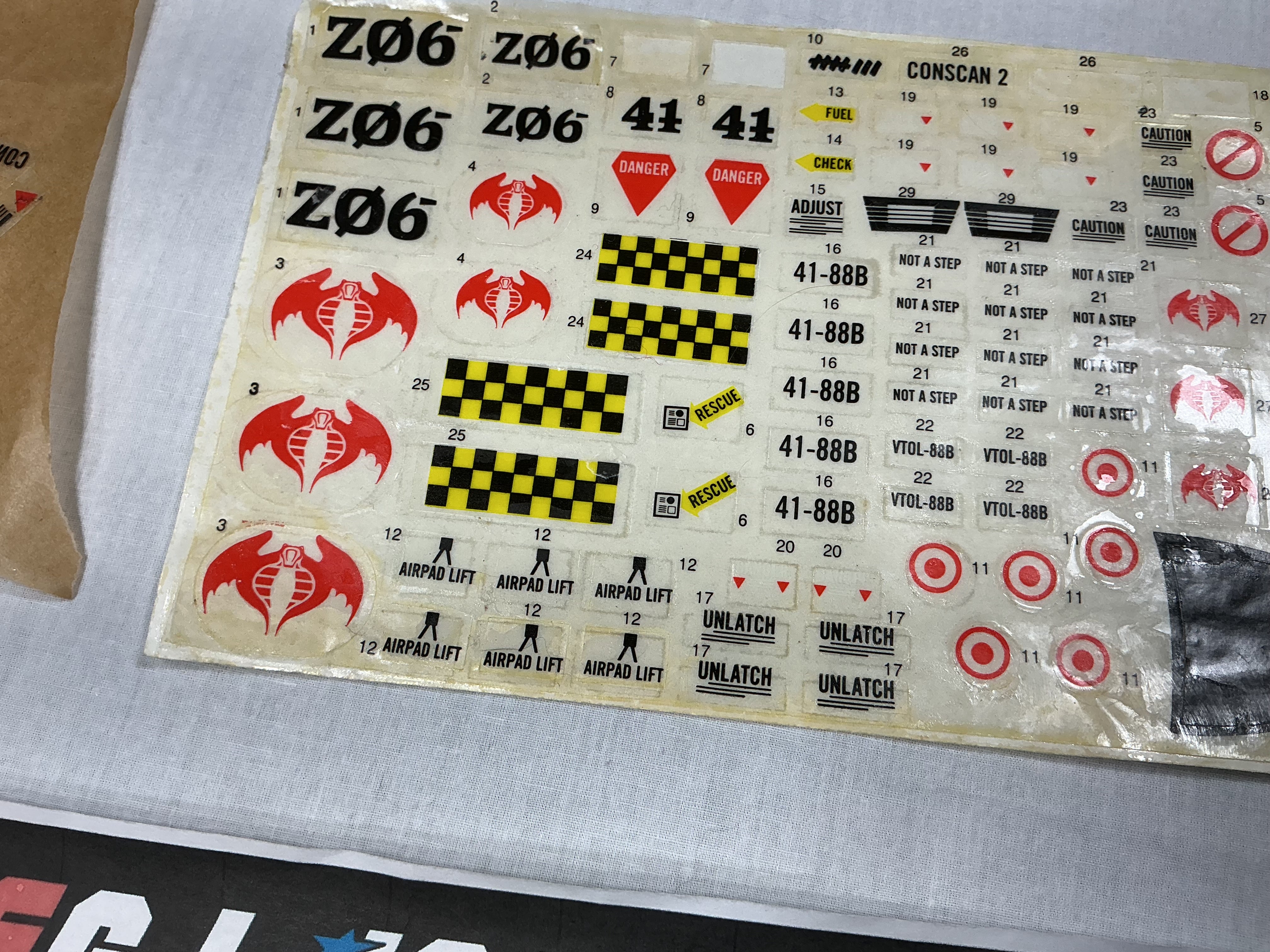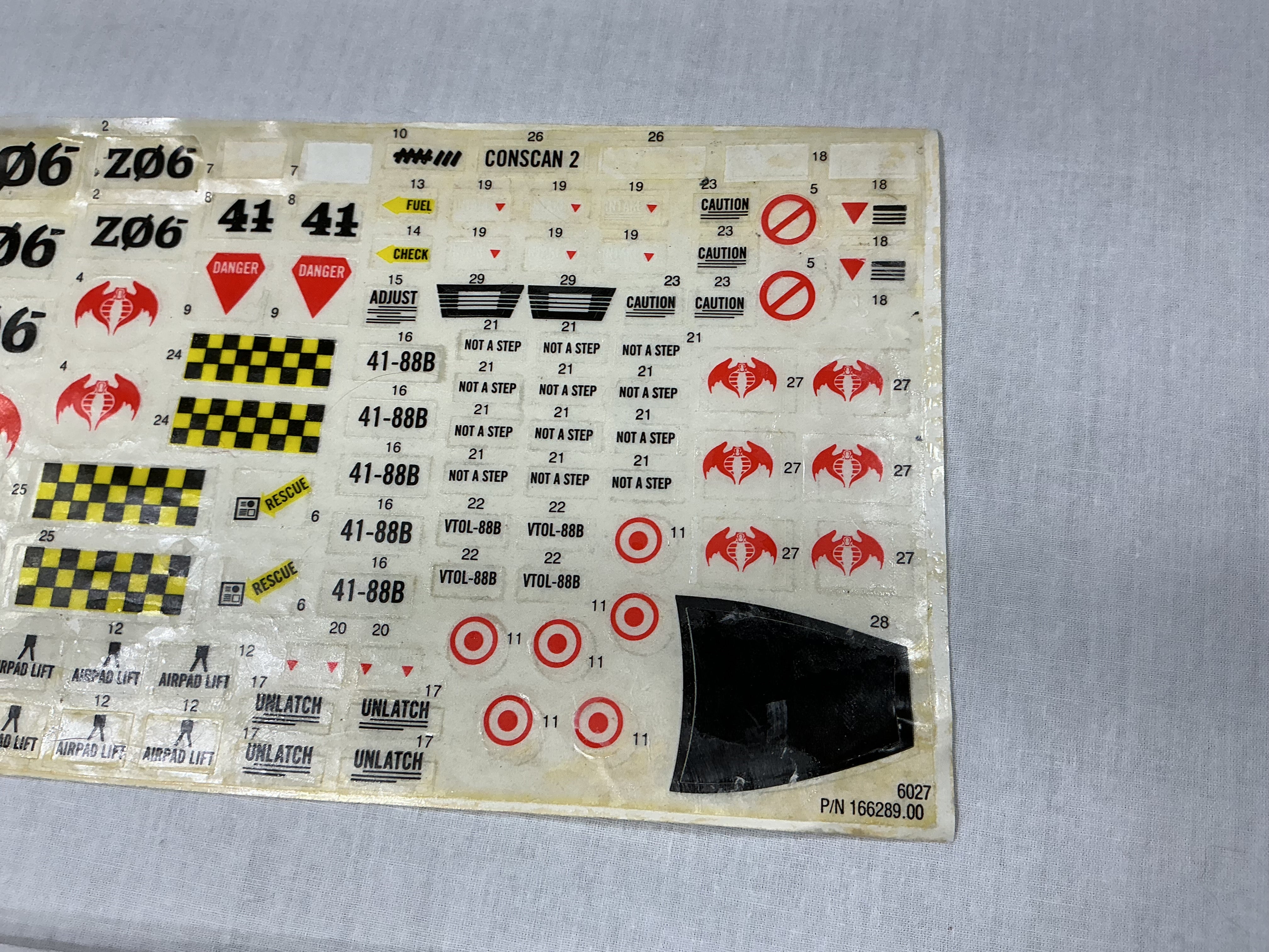 DECAL SHEET HAS SOME STICKINESS TO THE TOP OF IT..COUPLE FELL OFF..MAYBE MISSING ONE OR TWO